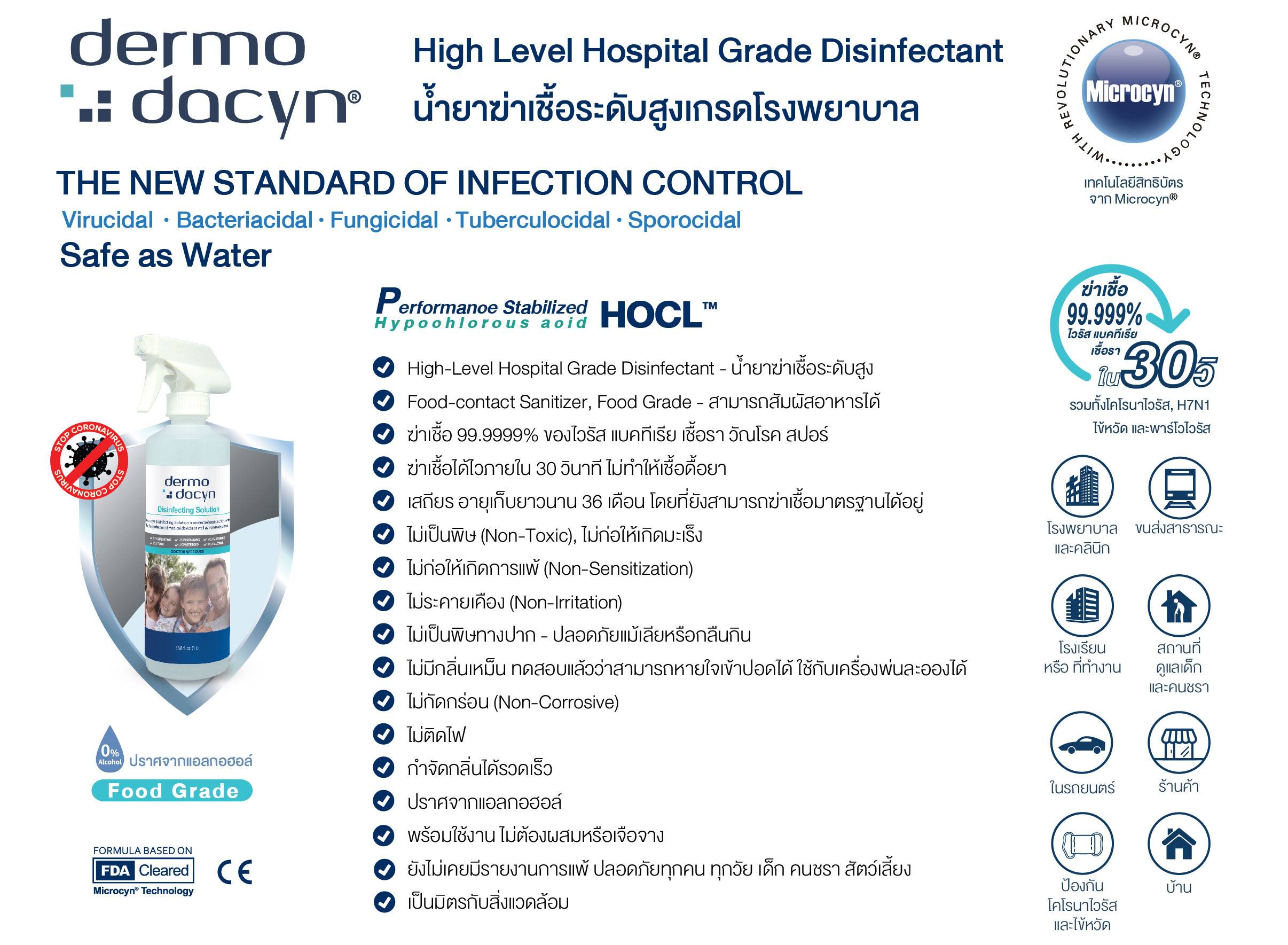 High-Level Disinfectant – ฆ่าเชื้อเครื่องมือแพทย์ และพื้นผิว สามารถสัมผัสตัวคนและสัตว์ได้ สามารถสัมผัสดวงตา จมูก ปากได้ ฆ่าเชื้อในอากาศ กำจัดกลิ่นไม่พึงประสงค์