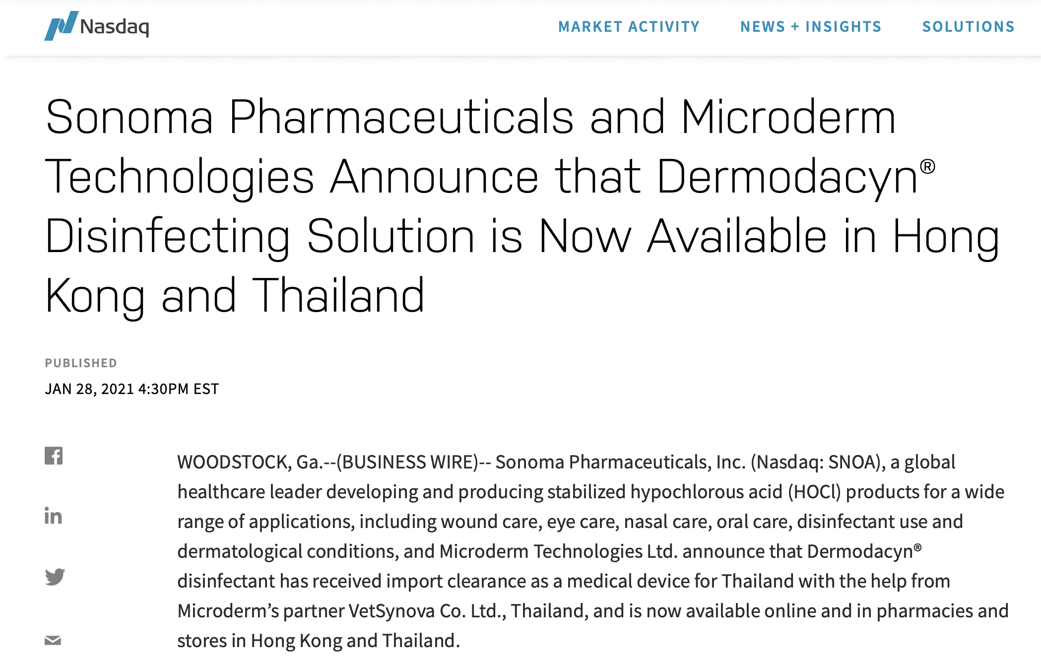 บริษัท Sonoma Pharmaceuticals และ Microderm Technologies ประกาศว่า น้ำยาฆ่าเชื้อ Dermodacyn® พร้อมให้บริการในฮ่องกงและประเทศไทยแล้ว